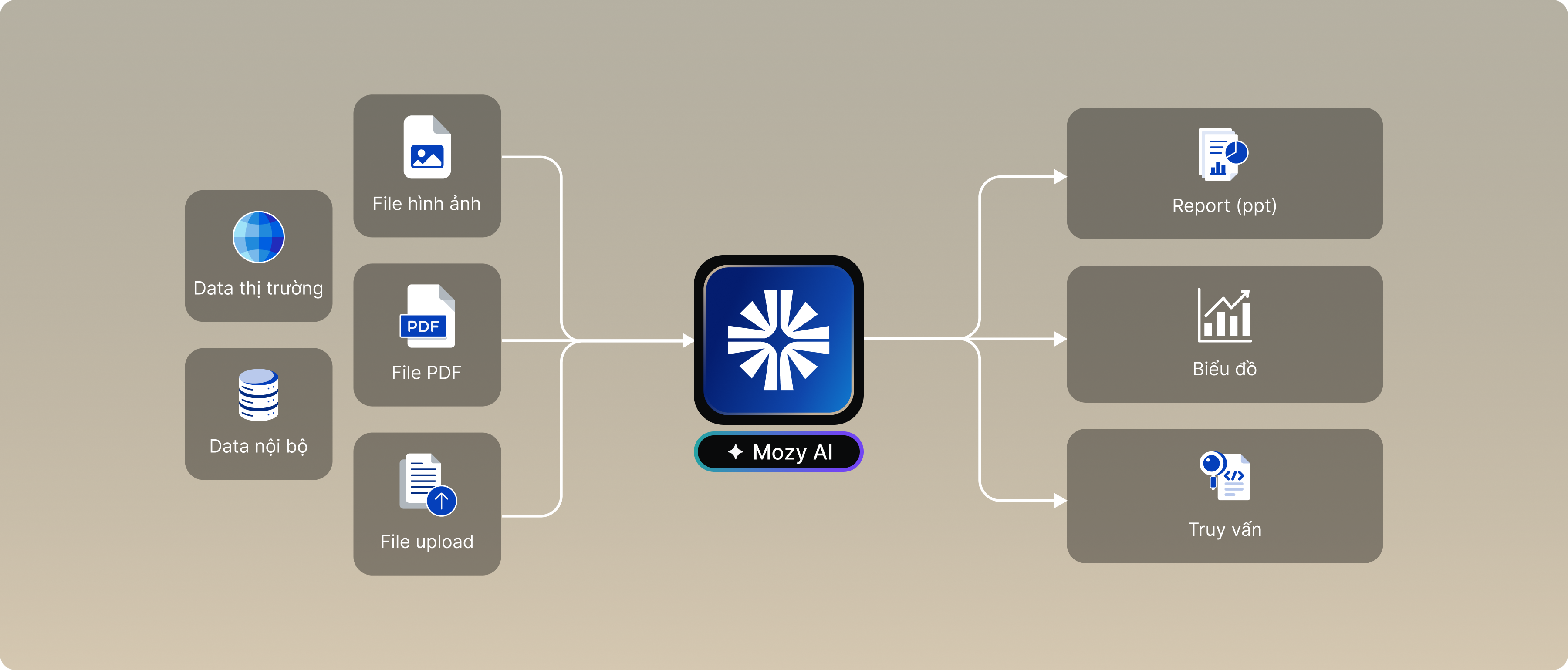 Mozy giúp team phân tích khai thác cả dữ liệu nội bộ, dữ liệu phi cấu trúc và dữ liệu thị trường trong cùng một workflow.